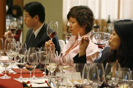 Wine lovers try red wine during a Chateau Haut Brion wine-tasting event in Beijing in this April 18, 2007 file photo.