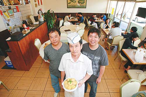 Moon Garden Restaurant owners Guo Ming Guang and So Sung Tak stood by chef Fong Siu Yick who held a dish of the deep fried tofu with minced shrimp and braised spinach.