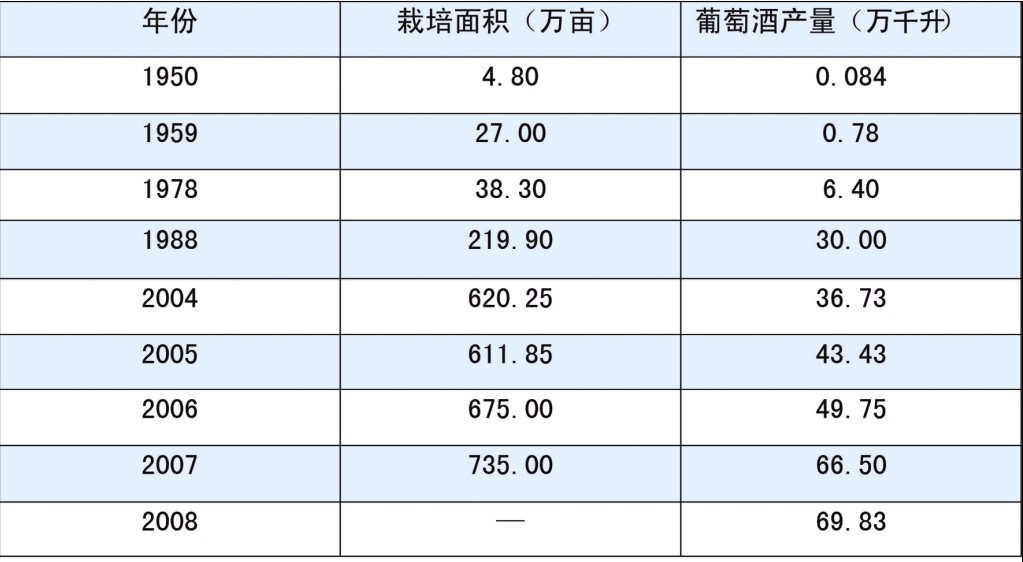 根据我国葡萄种植及葡萄酒发展规划,到2010年全国酿酒葡萄种植面积将达7.2万公顷,2015年将达10万公顷。我国葡萄酒产量将达到近80万千升,与澳大利亚相持平,达到世界第七、八位(表1)。