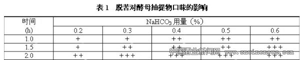 采用适当用量的碳酸氢钠对啤酒废酵母泥处理,并对抽提物感官质量和口感风味方面加以品评。从碳酸氢钠的用量和反应时间两方面进行实验,结果见表1。
