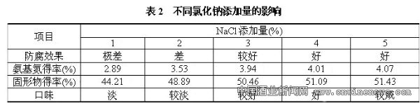 考虑到食品安全、风味、自溶促进剂后序分离及成本,氯化钠通常被认为是最理想的自溶促进剂。本实验研究了不同氯化钠添加量对氨基氮得率和固形物得率的影响,结果见表2。