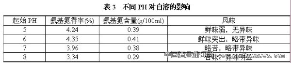 酵母细胞内含多种蛋白水解酶,其最适PH值在5-8之间,所以PH会影响蛋白质降解程度和产品口味。酵母细胞在弱酸近于中性的PH范围内,提高内源酶活力,使提取率增加。本实验研究了不同PH对自溶的影响,结果见表3。实验证明,当自溶液起始PH为8.5以上时,自溶液易出现发黄发臭现象;当自溶液起始PH为4.5以上时,氨基氮得率和含量均偏低。当自溶液起始PH为6-8,由于废酵母液呈酸性、加上自溶过程中释放的酸性氨基酸,将导致终了时PH降至5.5左右。从表3可以看出,过高、过低的自溶液起始PH对氨基氮得率的提高均不利,一般认为,PH为6-7比较合适,因此将实验的自溶液起始PH调节为6.0。
