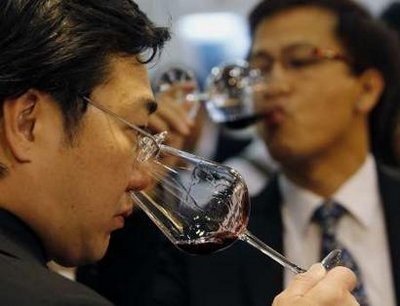 Visitors examine wine at Vinexpo Asia-Pacific held at the Hong Kong Convention and Exhibition Centre May 25, 2010. More than 9,500 visitors and around 700 exhibitors from 32 countries are coming to the three-day event, the largest international wine and spirits exihibiton in Asia-Pacific, organizer said.