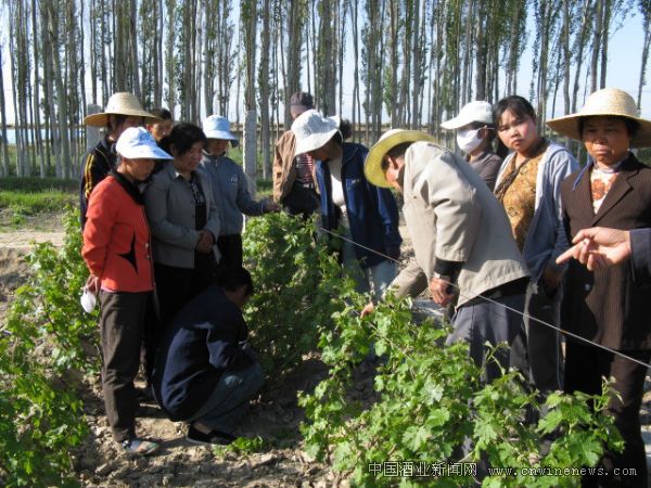 5月24日,新疆伊珠葡萄酒有限公司召开葡萄基地管理现场会,为全面提高葡萄原料的品质,公司专门从新疆生产建设兵团某部农科所请来园艺专家,现场进行抹芽、定梢技术指导,并讲解了葡萄园病虫害防治知识。图为农科所园艺专家为农户讲解葡萄管理技术。