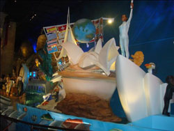 Under the theme 'ImagiNation', the site is divided into three sections named 'Journey', 'Discover' and 'Enjoy', educating visitors about Australia's culture, economy, history, indigenous community, heroes and way of life. Each section is linked by ramps which are enclosed by amber-coloured glass, making it seem like a hot desert day as the light shines through.