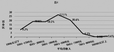 在收入结构上,我省白酒消费者的收入以中高水平的居多(如图2所示),其中月收入2001-3000元的占全部样本的27.1%,依次是3001-5000元占20.6%,1001-1500元占18.8%,1501-2000元占18.3%,1000元以下占9.2%,5001-7000元占4.1%,10000元以上占1.4%,7001-9000元占0.5%。考虑到实际调查过程中,调查对象存在一定藏富心理,对收入情况的填报较为保守,因此推断月收入在3000-6000元的消费者是白酒消费的最大人群。而月收入7000元以上人群比例偏低的原因,主要在于高端白酒竞争激烈,同时也受高端洋酒、葡萄酒的分流营销所致。