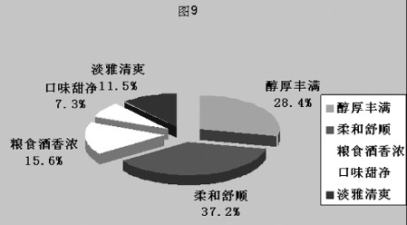 在白酒口感的选择上,是否柔和舒顺最受消费者关注,以此为选择要素的消费者占总样本量的37.2%(如图3所示),其次是醇厚丰满占28.4%,粮食酒香浓占15.6%,淡雅清爽占11.5%,口味甜净占7.3%。从这里可以看出,白酒饮用者在口感的选择上有着一定的一致性,同时对白酒的个性化香型要求也日益提高,这对于白酒企业来说是一个必须面对的挑战。