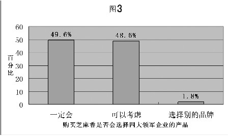 因此,在本次调查活动中,我们特意针对芝麻香领军企业做了相应调查,有超过一半的被访者明确知道芝麻香的四家领军企业,比例高达51.0%(如图2所示);另外有41.7%的消费者表示听说过芝麻香推出四家领军企业,但在无提示的状态下不能完整指出是哪四家;仅有7.3%的消费者不知道相关事宜。在知道景芝、趵突泉、扳倒井、泰山生力源四家芝麻香型白酒领军企业的消费者中,有49.6%的消费者表示如果购买芝麻香白酒(如图3所示),一定会从以上四家中选择;48.6%的消费者表示会在以上四家中考虑,仅有1.8%的消费者明确表示要选择别的品牌。