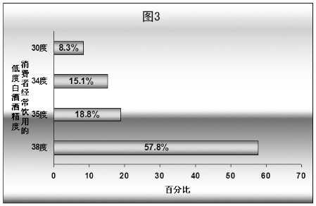 通过以上数据可以看出,38度、35度、34度是大多数消费者比较满意的低度浓香型白酒的酒精度。这一度数与国外大多数蒸馏酒的酒精度大体一致,也是我国白酒降度最初达到的水平,技术积累和工艺水品最为纯熟,因此其产品品质在低度酒中也是最为稳定和成熟的。此外,经过30多年的发展,白酒降度、低度酒生产的技术已基本成熟,但追求酒精度过低和口感过于柔和也与目前主要消费群体的消费习惯不相符合(选择30度以下的低度浓香白酒的消费者比例仅占13.8%)。因此38度——34度是低度浓香型白酒一个较为理想的酒精度区间。,既达到了白酒降度、减少酒精含量、保证身体健康的目的,又能保留高度酒的感官口味,照顾了大多数白酒消费者的饮用习惯,达到了“低度酒的度数、高度酒的口感”的要求。