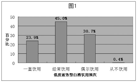 低度浓香型白酒是我省白酒市场消费的主要产品类型,在调查中我们也发现这一产品饮用频次高、应用范围广,在饮后感官评价上的反馈也十分理想。