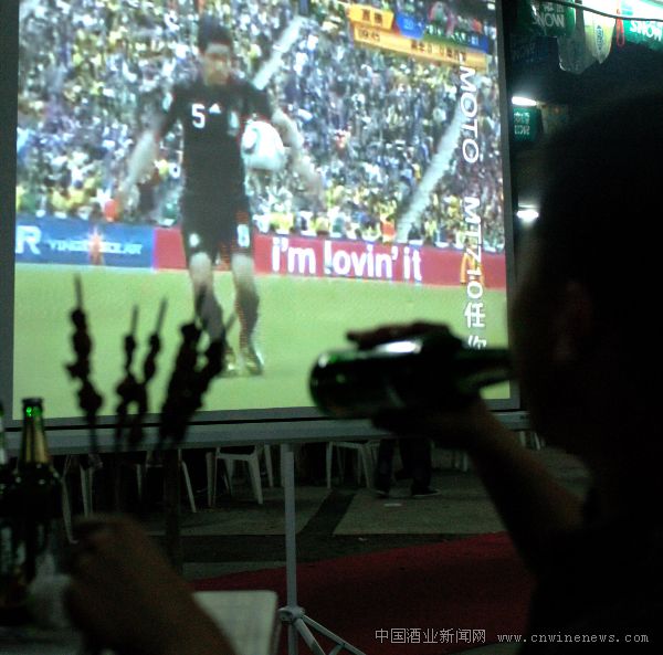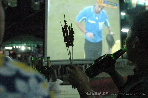 2010年南非世界杯开幕后,在甘肃省兰州市东方红啤酒广场上,兰州球迷一边喝啤酒吃烤肉,一边观看世界杯比赛。