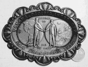 正面反映了博览会的中心建筑———宝石大厦的景色,四周是博览会的全称字样。奖牌( M E D A L O F A W A R D)字样刻在建筑物下面一个旋涡装饰的方块里,左右两边是两枝好看、优雅的棕榈树枝叶。由此衬托出博览会的象征、主题和中心位置。宝石大厦的背后是旧金山湾的海面,远处隐约可见名城的起伏山峦。一幅画面赋予奖牌丰富的地域和现场内涵,使人们感觉回到了90年前的昨天,重复当初展览、得奖、发奖的隆重场面,回忆当初得到的崇高荣誉。
