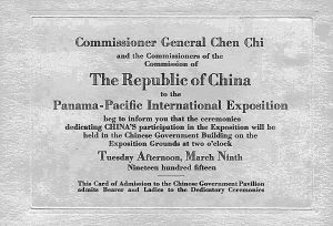 这张卡片记载了这样一个史实:时任农商部长的陈琪,以中国代表团团长和巴拿马赛会事务局局长的身份,颁发了这个邀请卡。上面说“邀请您于1915年3月9日星期二的下午2点在中国政府馆,莅临参加博览会的纪念活动”。