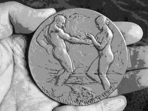 反面展现了一对青年男女的健康形体,他们面露腼腆,相互注视着对方,在光芒四射的初升的太阳光下,透过薄薄的云雾正在走到一起,左右两侧的海洋中间是一小条陆地,象征着由于巴拿马运河的通航进一步带来了大西洋和太平洋地区的团结和繁荣。底下有拉丁文“ D I V I N E D I S I V N C T A I V N X I T H O M O”字样,意思是“两岸之间的神圣联盟”。对最后一个字母“ O”仔细观察后发现,里面隐藏了奖牌设计者 J o h n F l a n a g a n的名称缩写。这个细节相当重要:笔者存有一些经典奖牌,根据经验,铜牌(或金牌、银牌)雕刻家除了以自己的方式和风格创作出与众不同的作品以外,还无论如何都会以各种方式在自己的作品上留下名字或简称,越是著名的雕刻家其名字越是难以寻找、难以辨认和识别,上面就是一例。