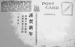 一张色彩活泼的明信片,由著名的旧金山 P a c i f i c N o v e l t y C o.出版,再现了博览会上园艺馆那古典和壮观的景象。然而,我看中的是这张明信片背面的信息,这是在当年的一月元旦被当作贺年片送出的。这位华人恭贺道:谨贺新年,并谢平素之疏远,尚祈将来之厚谊。全部是繁体字印制而成,寓意十分吉祥。