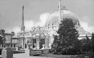 为博览会建筑一览,左侧的圆顶建筑是园艺馆,右侧的尖顶建筑是宝石塔,其高大、俊美和宏伟的外型是博览会的象征,也是我们熟悉的奖牌上面的典型标志。
