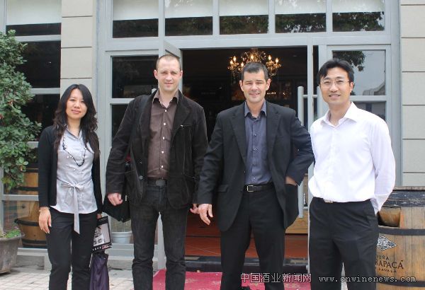 法国卡斯特兄弟股份有限公司中国区品牌总监高银砚、首席酿酒师Cedric、生产主管Stethane Boquet,建发酒业副总经文章来源华夏酒报理陈旭光(从左至右)。