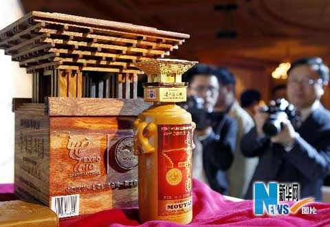 作为中国2010年上海世博会惟一指定白酒,国酒茅台在世博园内推出根据各国家自建馆的建筑风格设计的限量纪念版“世博喜酒”。新华社/记者刘颖/摄