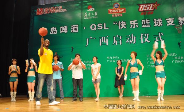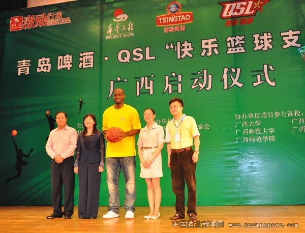 6月6日,青岛啤酒·QSL“快乐篮球支教行动”广西启动仪式在广西大学召开。中国青少年发展基金会副秘书长汪敏、共青团广西区委副书记严霜、广西青少年发展基金会秘书长吴宗勋、青岛啤酒华南营销有限公司总经理王新洪、NBA球星兰德里等众多嘉宾共同出席了活动。