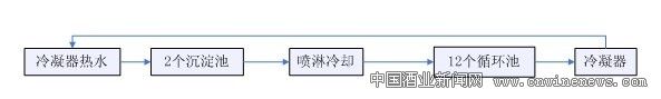 利用固态发酵法生产白酒的过程中,润料、加浆、冷却等都需要耗用大量的水,除了少量的水用于投料润粮、泼浆外,其余大部分的水用作冷却水,冷凝器中冷却水直接排放,对环境造成热污染,同时浪费了水资源。针对冷却水仅对水温有较高要求,而对水质要求不高的特点,为了避免水资源的浪费和环境污染,稻花香酒业与科研单位联合设计并安装了冷却水循环自动化控制装置,将车间除5个冷凝器之外的蒸酒用水经过冷却处理,即可重复进行循环利用。增设了14个循环水池、喷淋管、水泵,自动控制柜、工程师站等整套循环水设备。通过运行使基酒生产吨酒耗水量由原来的53吨降到38吨,与此同时还大大降低了污水的排放量。其工艺流程见图1。