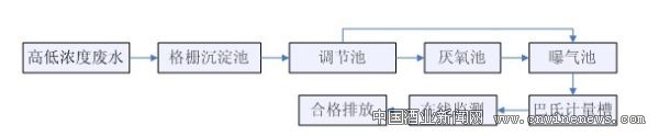 为了对全公司最终的污水进行综合治理, 2005年建成了稻花香污水处理站,日处理量为900吨,采用 “ 厌氧、好氧结合 ”工艺对白酒的生产和生活污水进行治理,处理后排放出水的水质达到国家《污水综合排放标准》(GB8978-1996)中一级标准,优于国家要求,国家标准为COD100mg/L,实际排放25.5mg/L,BOD国家标准为30mg/L,实际排放为15.5mg/L,pH值国家标准为6.9,实际排放为6.42,SS国家标准为≤70,实际排放为49,实现了清污分流。污水经处理后排放污染物浓度经宜昌市环保局监测100%达标排放,不仅为公司创造了文明清洁的生产环境,还减轻了对周围环境的污染,保护了生态环境。其工艺流程见图3。
