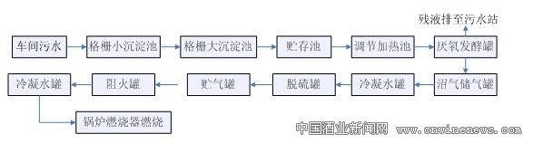 酿酒废水如黄水、冲洗水、底锅水等是高浓度有机废水,COD值2.5万mg/L—5万mg/L,悬浮物含量100mg/L—250mg/L。2009年稻花香酒业投资100多万元建成了酿造废弃物治理及综合利用工程,日处理能力为150m³-200m³。此工程包括:收集池、好氧工艺处理污水、发酵产沼气,生产用10吨锅炉燃气改造。滤液经好氧处理后污染物稳定就可达标排放。可大量减少COD排放量,大大促进了废物减量化、资源化和无害化。其经厌氧发酵产生的沼气经气水分离及脱S处理后送储气罐,通过管道则可用于锅炉燃料。这样既节约资源,又减少污染,酿酒废水每日排放量 70m³-80m³,可日产沼气400m³-450m³。每立方米沼气的热值相当于1公斤标煤,每年可节约燃煤200多吨。工艺流程见图4。