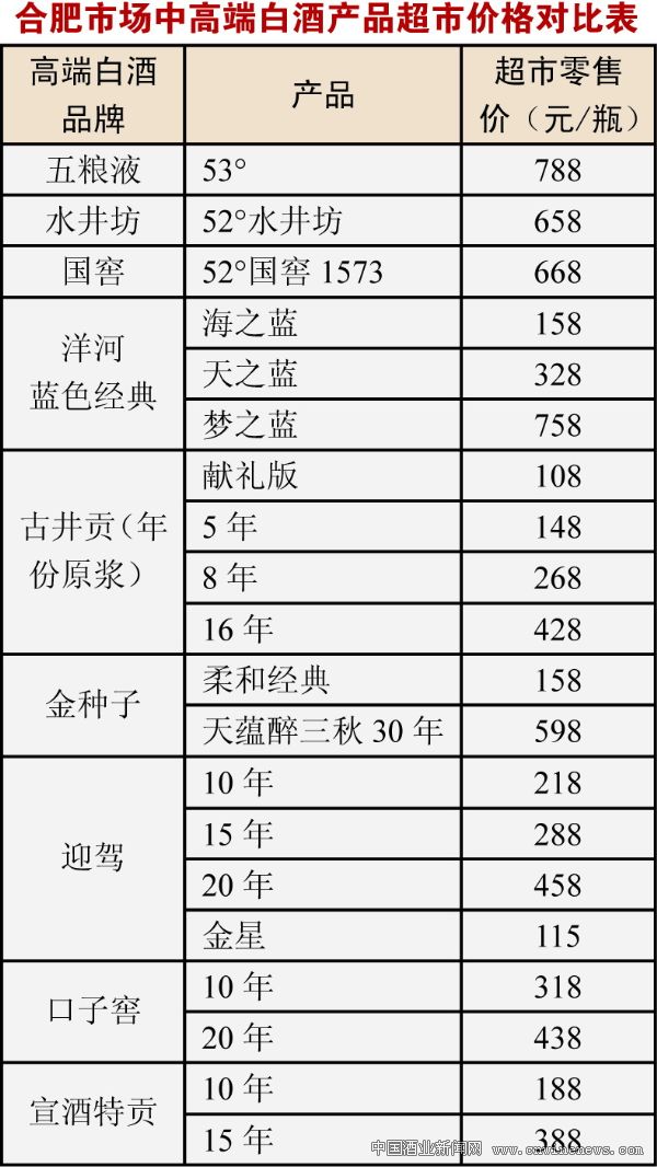 超市的中高端白酒品牌中,少见高炉家、皖酒、文王等的产品,这些品牌的超市价格在50元至100元之间。