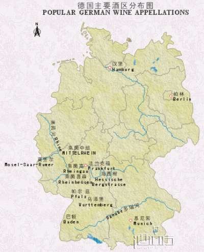 据悉,德国的葡萄酒产区是全世界葡萄酒产区的最北端,分布在北纬47°-52°之间,主要集中在莱茵河岸和莫舍河岸,包括莱茵、纳赫、摩塞尔河流域、巴登、乌腾堡等地。