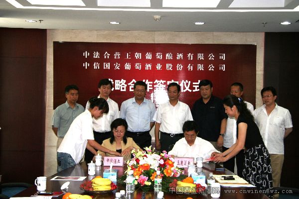 7月6日,天津王朝酒业集团有限公司与中信国安酒业有限公司在天津王朝公司签署了战略合作框架协议。王朝酒业董事长白智生,总经理高峰,中信国安集团副董事长、中信国安酒业董事长李建一,中信国安酒业副董事长、总经理李新萍出席了签约仪式。