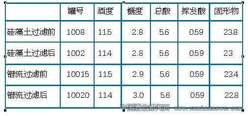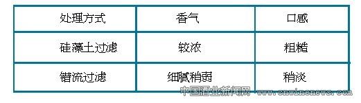 张裕公司以下胶处理后的福建干红葡萄酒为试验对象,分别用硅藻土过滤和错流过滤,通过色泽、香气、生物稳定性、成本方面的对比,研究硅藻土过滤和错流过滤对风味和生物稳定性影响的差别,选用既保证原酒的稳定性,又最大程度保留原酒风味和口感的过滤方式。