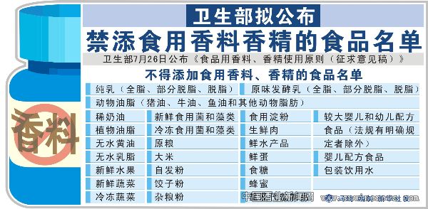 新华社北京电 根据卫生部7月26日公布的《食品用香料、香精使用原则(征求意见稿)》,凡添加了食用香料、香精的食品,都将按照国家相关标准进行标识。