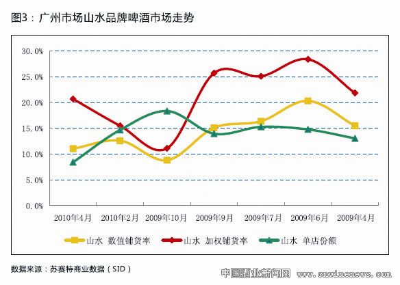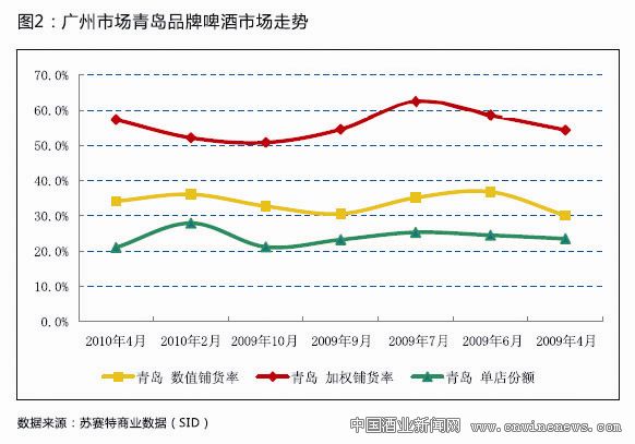 当然,珠江啤酒通过控制终端来提高销量的做法确实也起到了一些成效,早前珠江啤酒对外发布消息,集团2010年首季实现开门红,产销量同比增长近两位数。苏赛特商业数据(SID)的月度追踪数据显示,在大本营广州市场,一年来珠江啤酒加强了对质量较好的终端店的开拓和维护,单店份额有明显提升,2010年4月份的市场份额比去年同期提升了10个点。