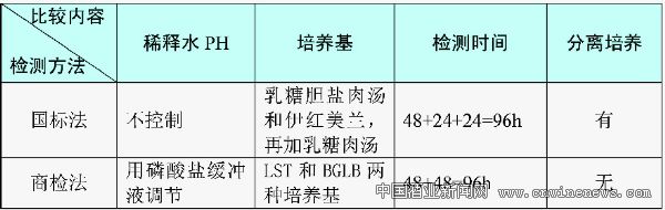 目前食品行业测定大肠菌群的方法有国标法(GB)、行标法(SN)和快速检测法(3M)。三种方法各有特点,其中,国家标准采用三步法:1)乳糖发酵试验:样品稀释后,选择三个稀释度,每个稀释度接种三管乳糖胆盐发酵管。36±1℃培养48±2h,观察是否产气。2)分离培养:将产气发酵管培养物转种于伊红美蓝琼脂平板上,36±1℃培养18h—24h,观察菌落形态。3)证实试验:挑取平板上的可疑菌落,进行革兰氏染色观察。同时接种乳糖发酵管36±1℃培养24±2h,观察产气情况。报告:根据证实为大肠杆菌阳性的管数,查MPN表,报告每100ml(g)大肠菌群的MPN值;行标法采用两步法:1)推测试验:样品稀释后,选择三个稀释度,每个稀释度接种三管LST肉汤。36±1℃培养48±2h,观察是否产气。2)证实试验:将产气管培养物接种煌绿乳糖胆盐(BGLB)肉汤管中,36±1℃培养48±2h,观察是否产气。以BGLB产气为阳性。查MPN表,报告每ml(g)样品中大肠菌群的MPN值。两种方法的比较结果见表2所示。