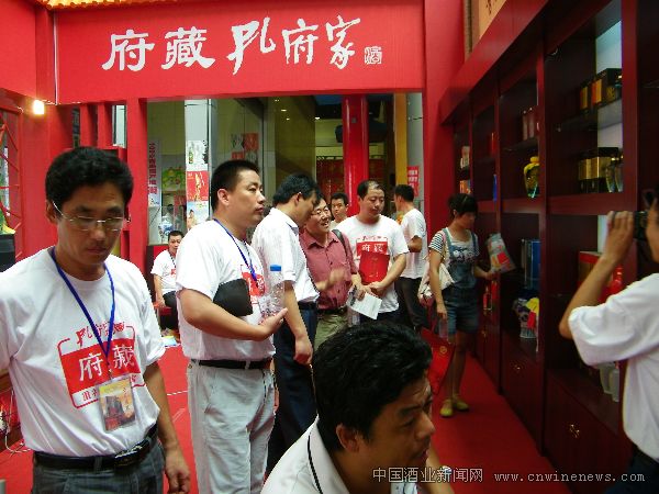 随着曲阜孔府家酒业有限公司不断加大拓市力度,孔府家酒在省外市场上的知名度和影响力逐步扩大,在本届山东糖酒会上,前来洽谈和订货的省外经销商数量增多。图为许多经销商聚集在孔府家酒展位前考察产品。