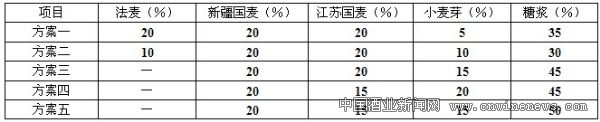 目前,公司采取麦芽有法麦、新疆国麦和江苏国麦,配比使用。为了保持啤酒的稳定性,须加小麦芽,对小麦芽和糖浆的不同的比例方案进行了适当调整。