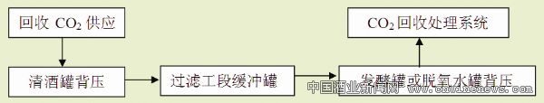 1) 清酒与包装不同步时,可与对应付酒发酵罐平衡背压。当发酵罐体空出后,还可以考虑罐体内CO2回收至CO2回收处理系统,但回收不会彻底。
