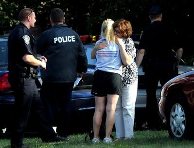 8月3日,在美国康涅狄格州曼彻斯特,工人和亲属在枪击事件发生后相互安慰。