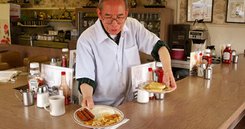 Prices: One egg with hash browns, toast, $2.75; one hotcake, $1.95; three eggs, three bacon or sausages or a hamburger patty, hash browns, and toast, $3.60; ham-and-cheese omelet (same sides), $3.85; Denver omelet, $4.10; three eggs with ham, $4.10; two hotcakes, two eggs, bacon, sausage, or hamburger patty, $4.10; French toast with bacon, sausage, or hamburger patty, $3.75