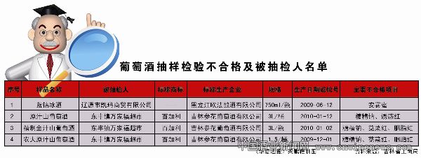 根据国家工商总局统一部署、结合吉林省工商局年初制定的抽检计划,6月22日至26日,吉林省工商局集中对长春、辽源、梅河口、柳河、辉南等地部分文章来源华夏酒报葡萄酒经营单位进行了食品质量抽样检验。本次抽检了长春、辽源、梅河口等地6个经营单位、21个生产厂家生产的50个批次的葡萄酒产品,检验的主要项目有标签、糖精钠、安赛蜜、山梨酸、苯甲酸、色素、甲醇、铅等。