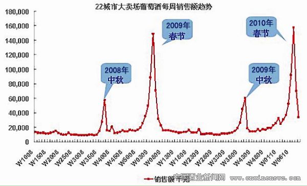 2010年1月—7月,由尼尔森市场研究有限公司执行零售监测的全国22个城市大卖场葡萄酒销售额为8.41亿元,对比去年同期的7.53亿元,增长了0.88亿元,增长率为11.7%。销售额的增长一方面来源于销售量的自然增长7.7%,另一方面来源于整体品类的“结构性升级”。而“结构性升级”即高端产品份额的进一步提升,主要是由逐年增长的“节庆高峰”所拉动。