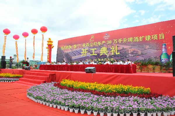 9月9日,青岛啤酒(厦门)有限公司年产30万千升啤酒产能扩建项目开工典礼在福建省厦门市同安区环城东路公司扩建项目工地举行。青岛啤酒股份有限公司副总裁孙玉国、青岛啤酒(厦门)有限公司董事长、青岛啤酒东南营销有限公司总经理蔡志伟、青岛啤酒(厦门)有限公司总经理刘德利等出席了仪式,并为奠基培土。