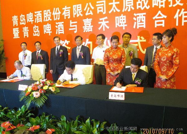 9月10日,青岛啤酒股份有限公司太原战略投资项目暨青岛啤酒与嘉禾啤酒合作项目签约仪式在太原举行。中共山西省委常委、太原市委书记申维辰,中共太原市委副书记、市长张兵生,中共太原市委常委、副市长荣彤,国家级太原经济技术开发区管委会主任张金旺,青岛啤酒股份有限公司总裁孙明波、副总裁黄克兴,山西省、太原市相关职能部门负责人,太原经济技术开发区党政领导和部门负责人等100余人出席了签约仪式。百年品牌青岛啤酒拥抱千年古城太原,太原项目将改写青岛啤酒在山西地区没有工厂的历史,进一步完善青岛啤酒的战略布局。