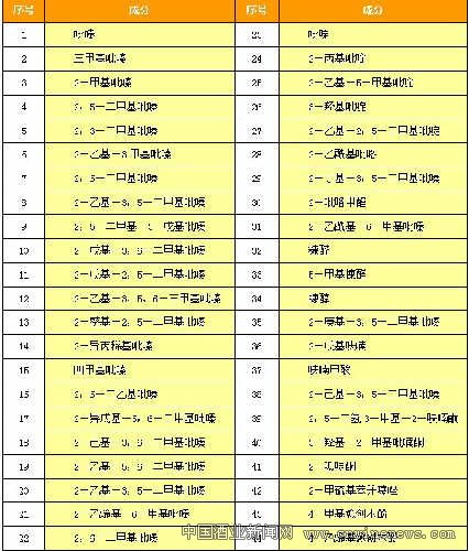 1.2“国井”复粮芝麻香酒所含微量成分众多,目前确定了500余种(部分成分见表1)。微量成分中以含氮化合物吡嗪类为主体,辅以呋喃类、噻唑、酚类、含硫化合物等,共同构成复合幽雅的香气。