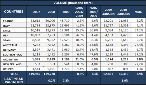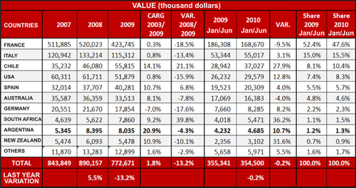 South Africa’s performance is also important. The South African main wine producer grew 36.2% in the first six months of 2010, keeping the winning streak of 2009, when it grew 39.8%.