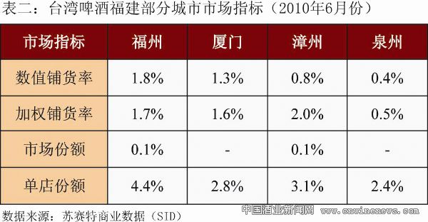 福建市场的配角除了雪花啤酒,还有很多品牌,在这里有一个配角不得不提,那就是高调赞助广州亚运会的台湾啤酒。据苏赛特驻福州访问站数据采集员调查,进入福建市场一年,台湾啤酒表现并无太大起色。不过2009年底在推出台魅啤酒后,铺货率有所上升,主要以现代渠道为主,其在泉州市场表现较为突出。但台湾啤酒在福州市场和厦门市场表现平平。