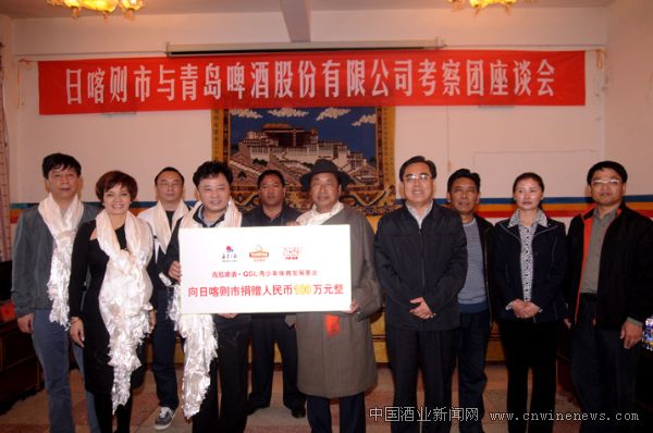青岛啤酒考察团一行和日喀则市委市政府领导共同见证青岛啤酒金志国董事长向日喀则市达次市长捐赠100万善款