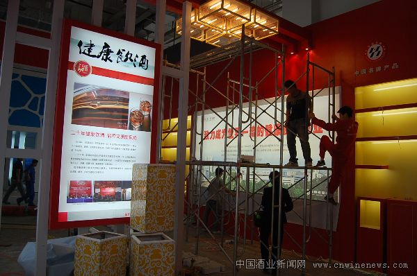 作为保健酒龙头企业,劲牌有限公司首次在全国糖酒会上设置展位,并将“健康饮酒”的理念带到了2010年秋季糖酒会上。图为10月7日劲牌有限公司员工在布置糖酒会展位。
