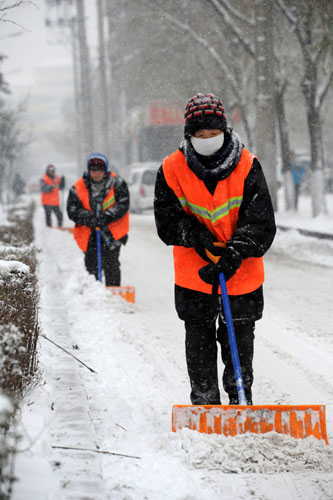 Sanitation workers shovel snow on Saturday from the streets of Harbin, capital of Heilongjiang province. Wang Song/Xinhua