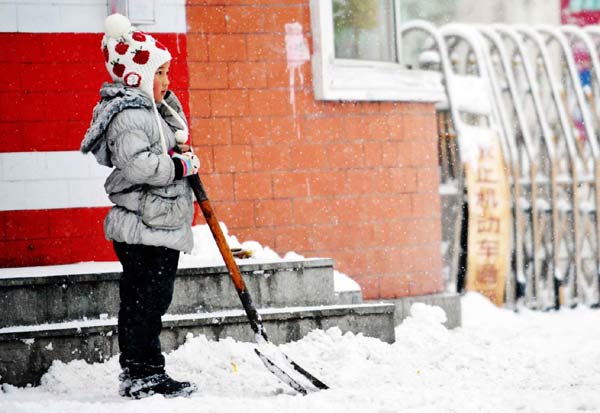 A child takes a break after shoveling snow in Harbin. Wang Jiancheng/Xinhua