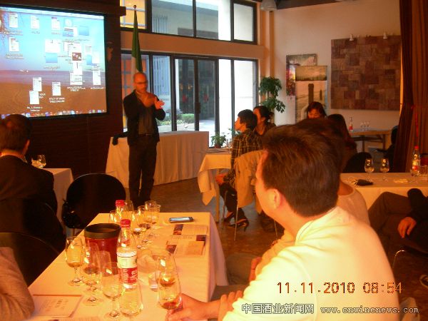 11月11日,意大利国家酒业促进中心在上海举办葡萄酒与艺术鉴赏会,向中国消费者推广葡萄酒,传播葡萄酒文化与艺术的魅力。图为意大利专家在传授葡萄酒文化知识。